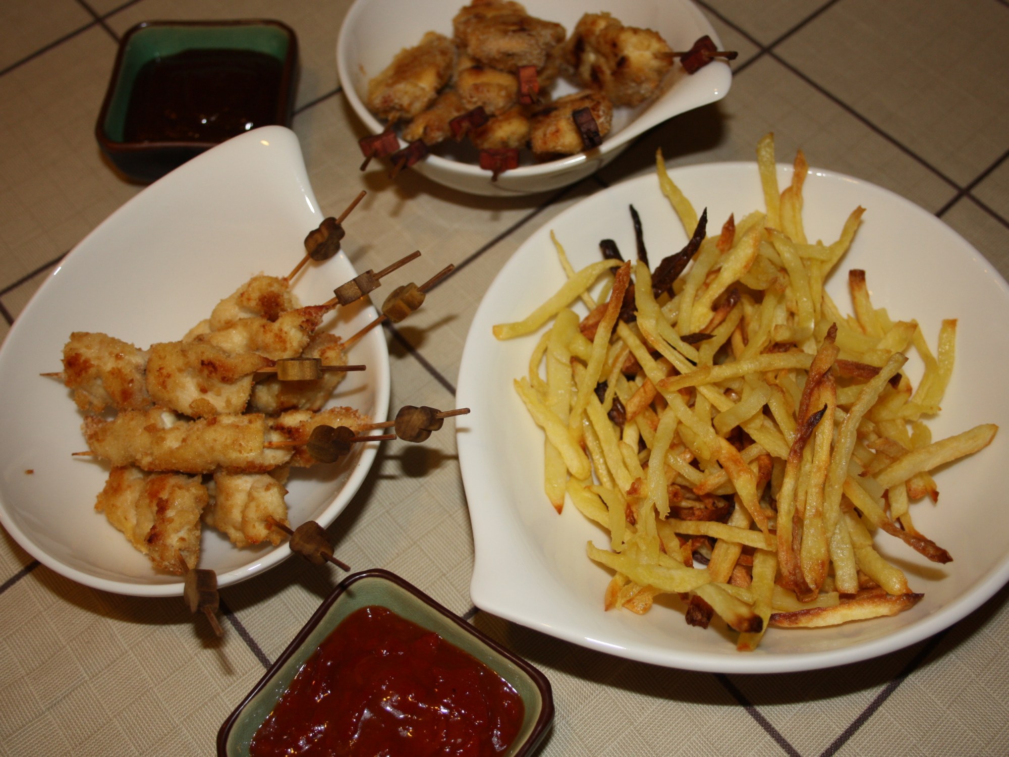 Hoy os traigo unas brochetas de pollo súper fáciles de hacer y que están muy ricas. Además, las vamos a acompañar de unos bastones de patata ligeritos.
