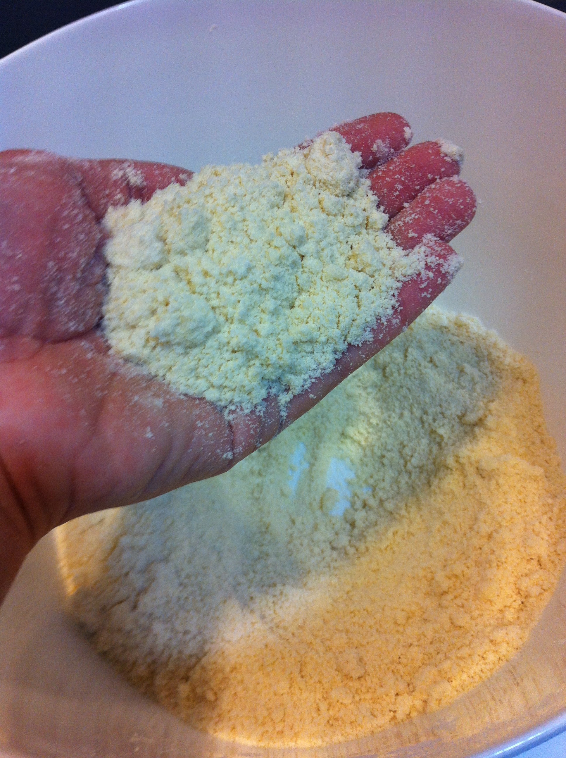 En un bol mezclamos la harina, con el azúcar, la levadura y la sal. Añadimos la mantequilla y mezclamos con ayuda de los dedos, deben parecer migas. Reservamos.