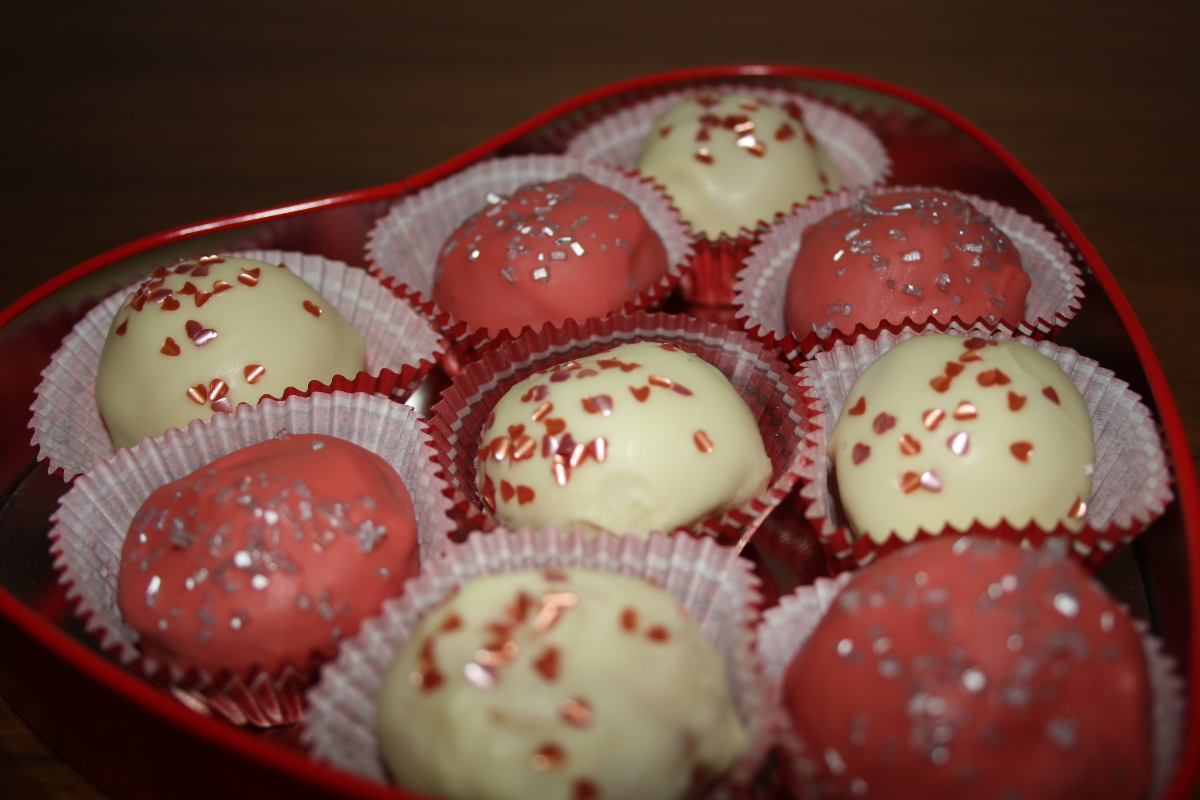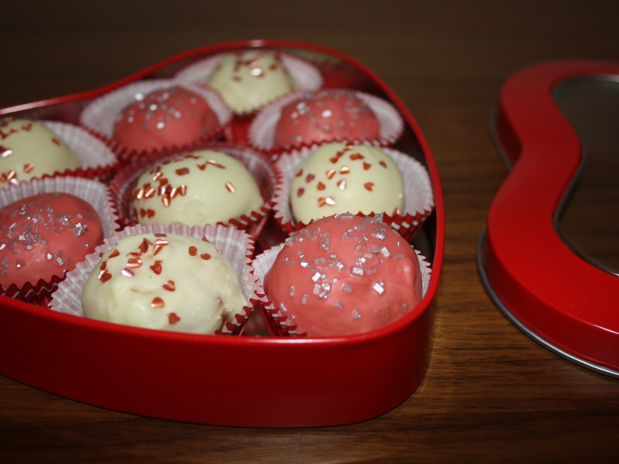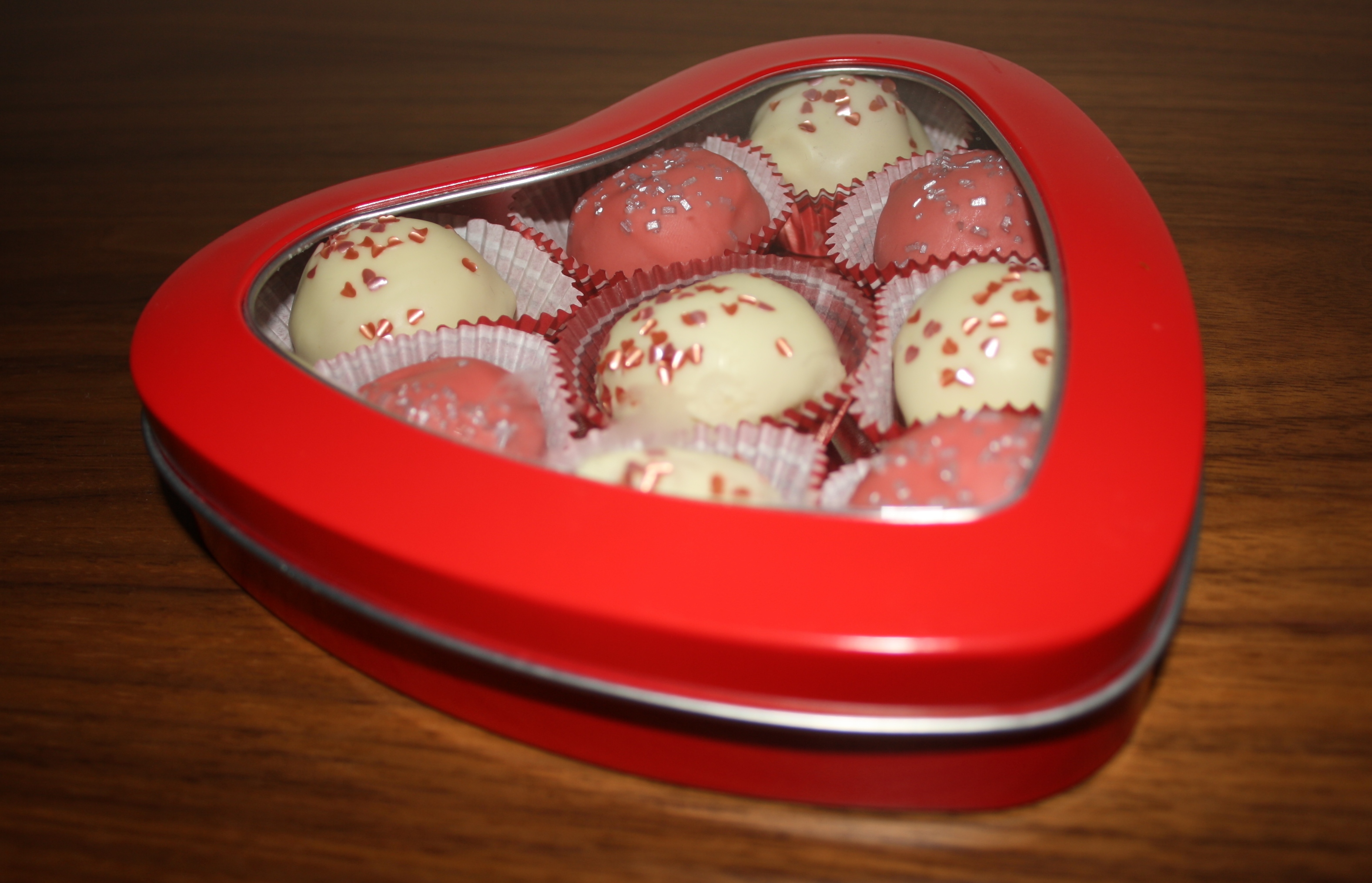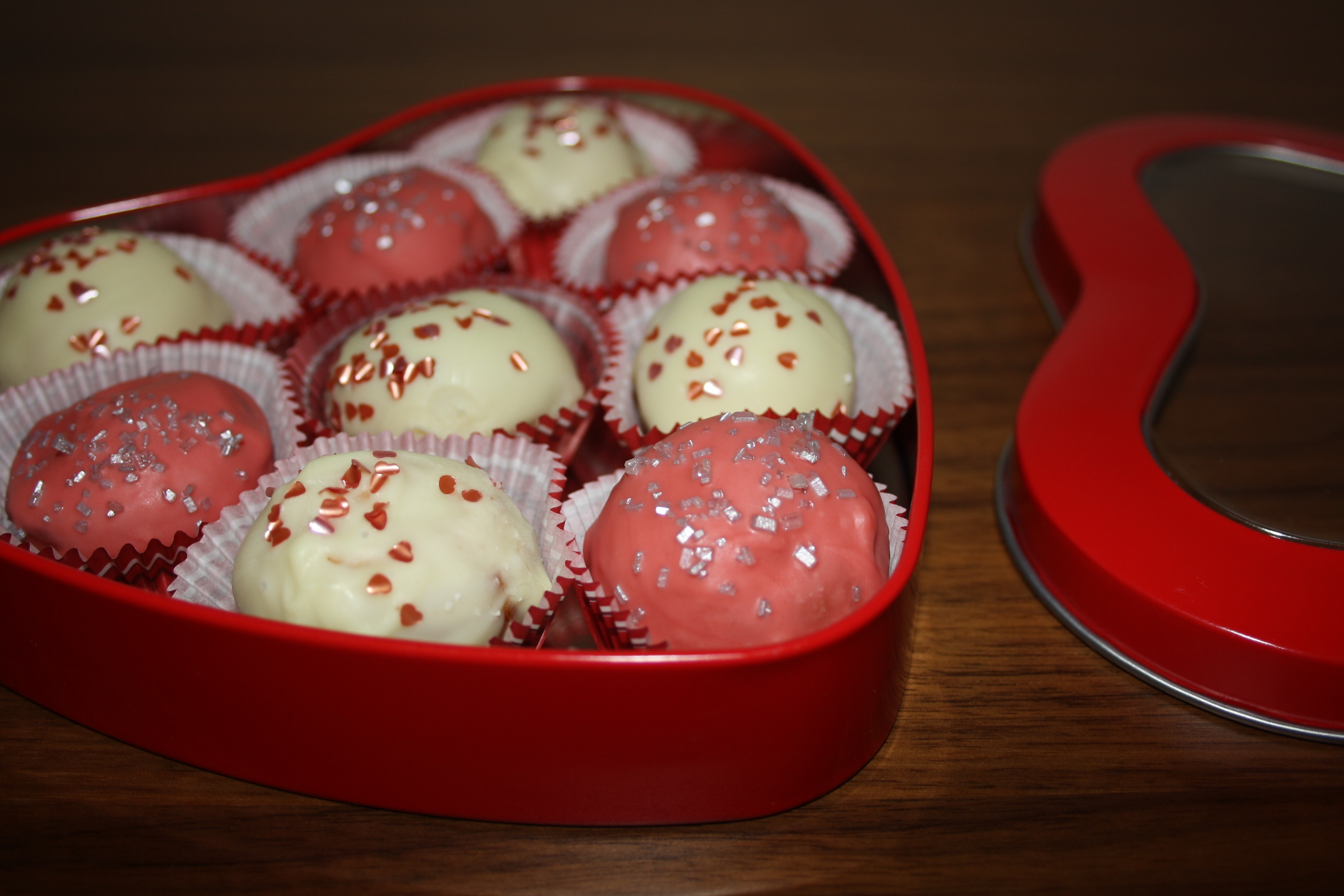 Después de hacer las bolitas de bizcocho con la baby cakes, las he decorado con Chocolate Blanco y los he puesto en moldes de papel a modo bombón y con su cajita comprada en Tiger. ¿Quién no se vuelve romántico con cosas así?