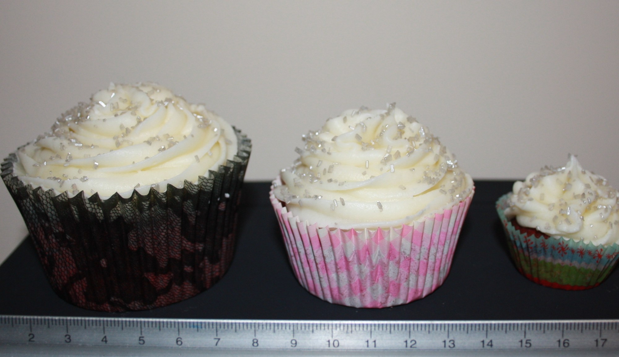 Generalmente, utilizo los moldes del cupcake normal, el del medio de la foto. Tienen un diámetro de unos 4cm y las recetas que suelo hacer para 12 cupcakes emplean ese molde.