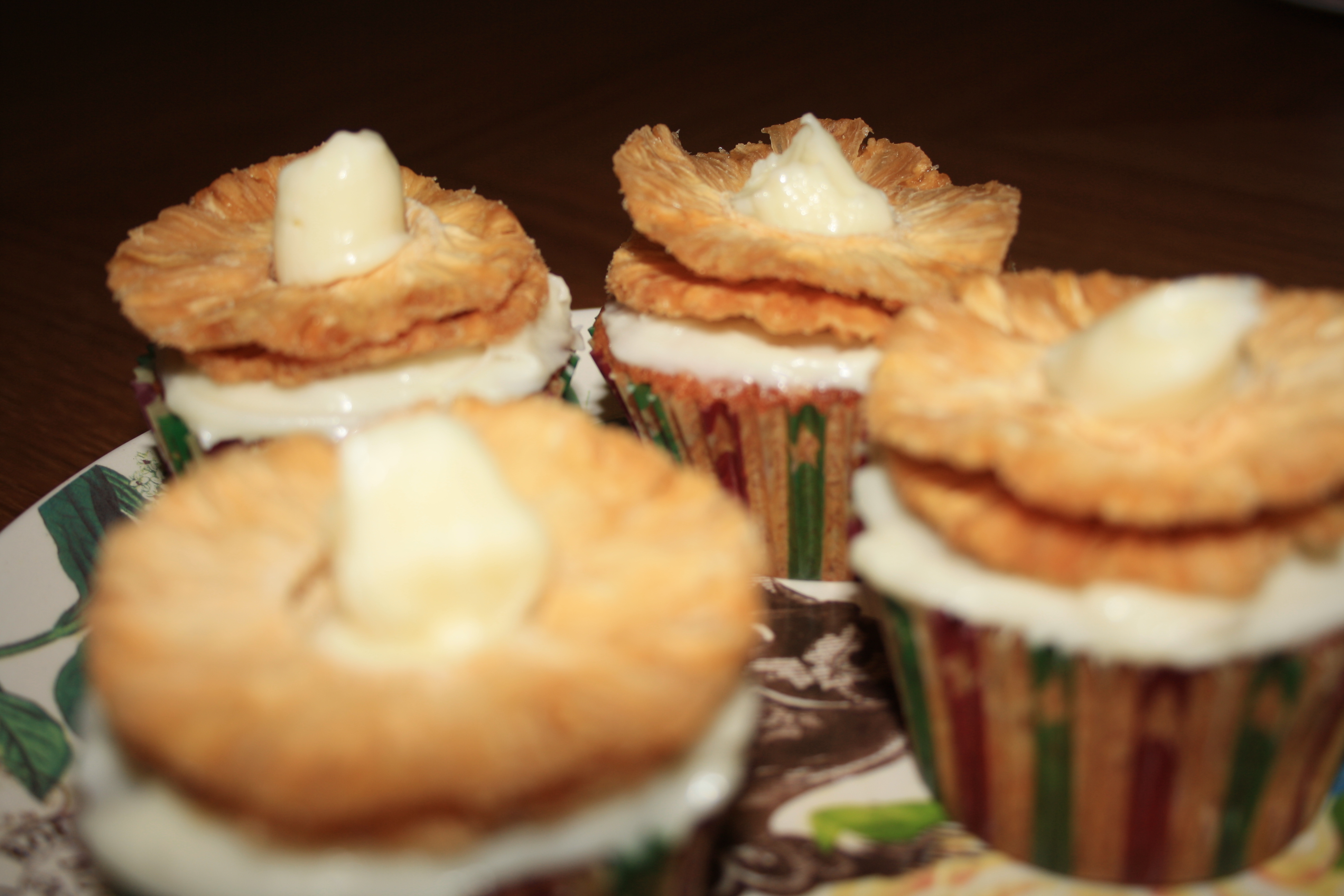 Batimos los ingredientes durante 3-5 minutos con la batidora de varillas. Cubrimos los cupcakes con una paleta y les ponemos encima unas rodajas de piña secada. Rellenamos el centro con unas bolitas de buttercream… y a disfrutar!!!