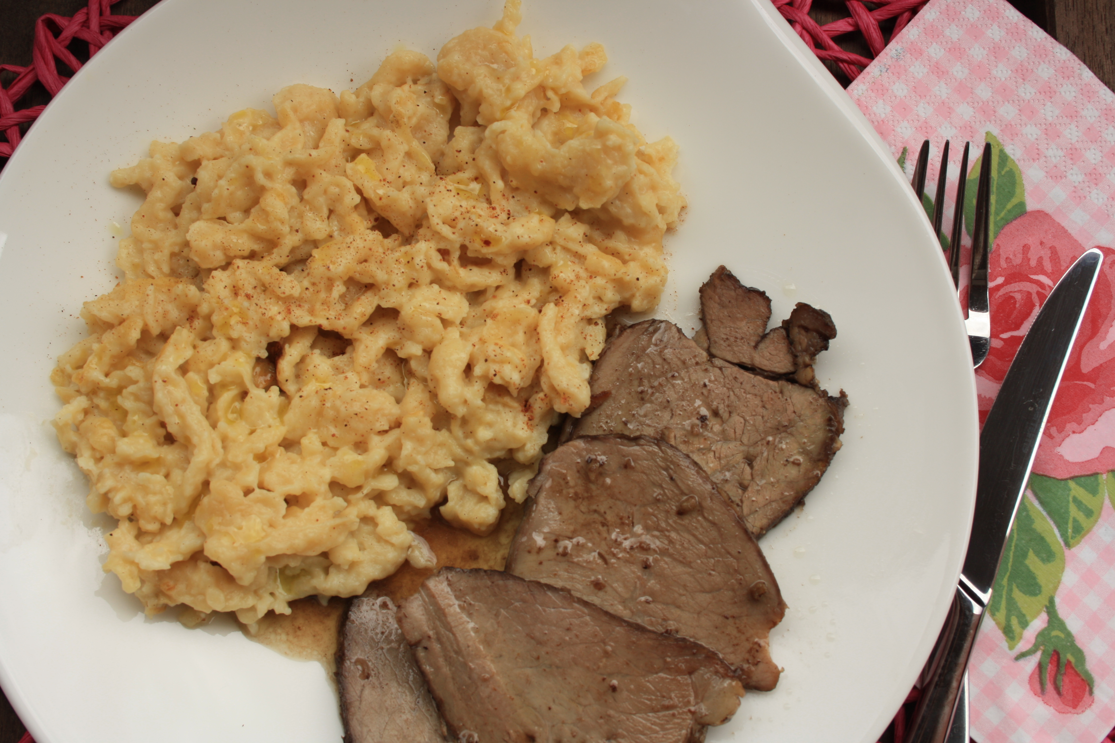 Spaetzel paso a paso . azucarglass y mas 2Entonces los salteamos con mantequilla y les añadimos nuez moscada. Ahora ya podemos disfrutarlos!! yo me los comería como plato único porque no me canso de ellos, pero se suelen servir de guarnición de carnes. En esta ocasión los he acompañado de un solomillo asado de carne de Galicia traída por mi padre.