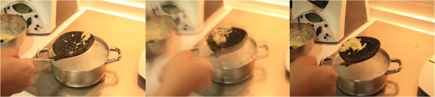 IMG_9479En mi caso, la forma irregular que tienen los späetzle la consigo como me enseñaron en Frankfurt, cortándola a cuchillo sobre una tabla al tiempo que se deja caer sobre agua hirviendo, pero no me lío más, os lo cuento sobre la marcha.