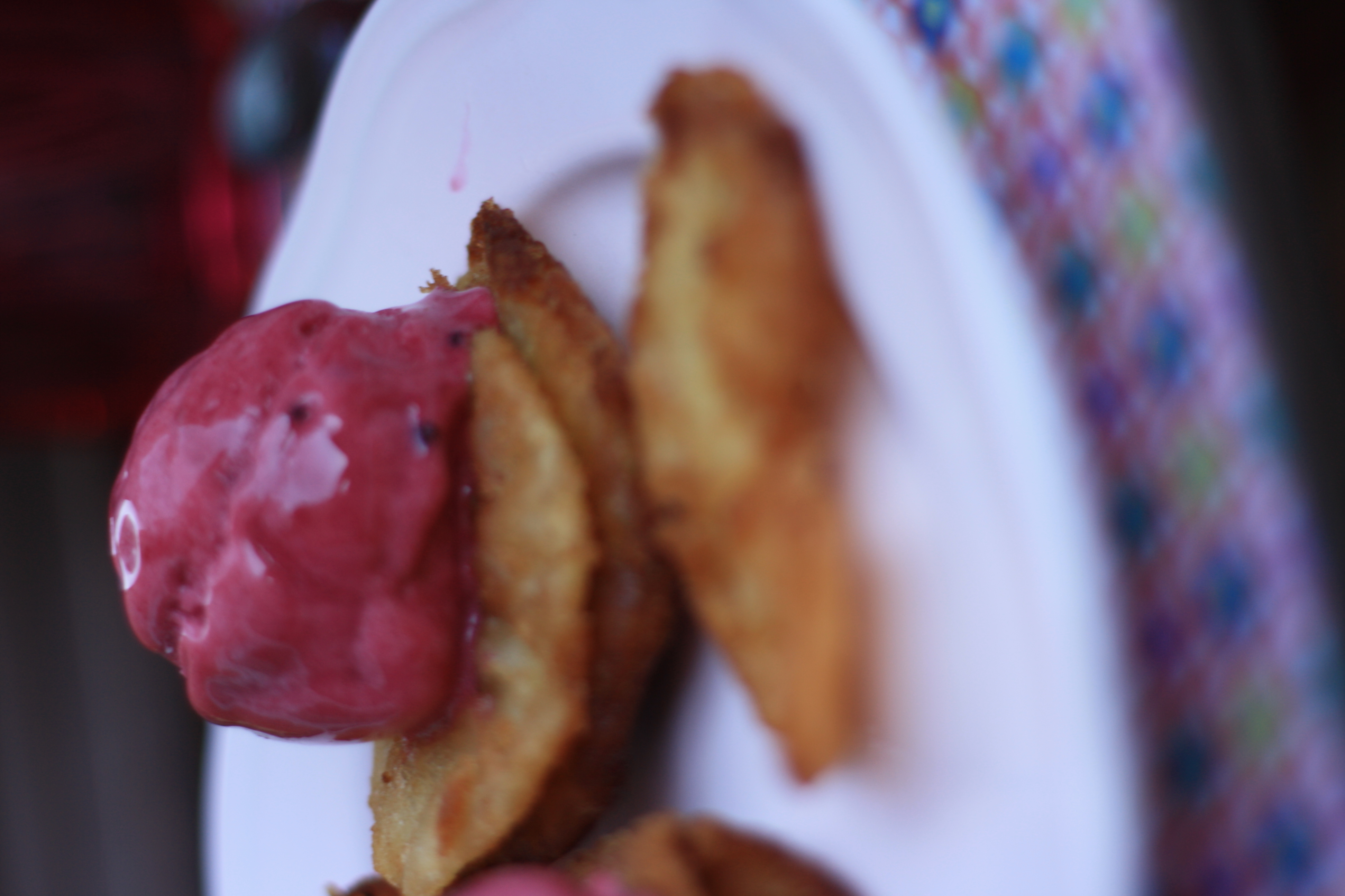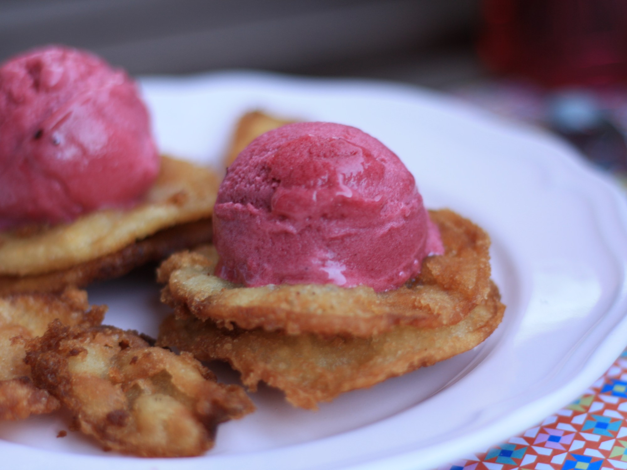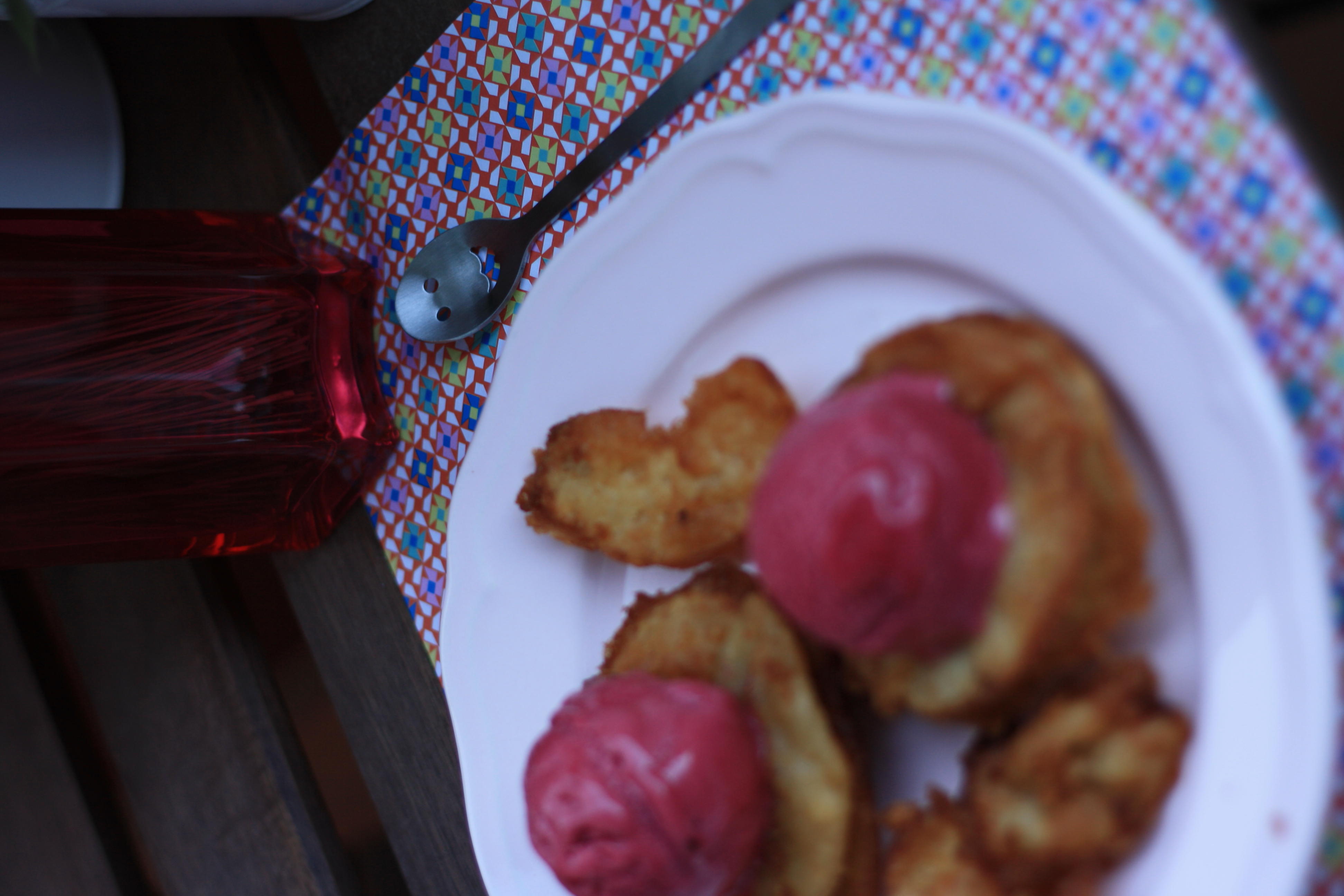Lo escurrimos bien, lo dejamos enfriar… y lo coronamos con helado de frutos rojos. El toque de la manzana súper dulce y el helado frío de frutos rojos con su toque ácido, es una pasada.