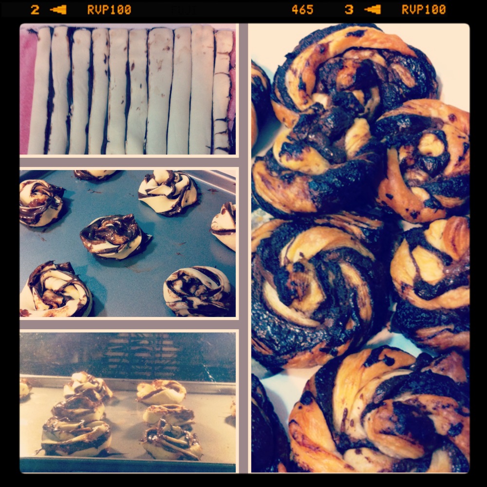 Os resumo: extendemos la masa, untamos con Nutella, doblamos por la mitad, cortamos en tiras y enroscamos creando barritas. Ponemos sobre una bandeja forrada con papel de hornear y horneamos unos 10 minutos a 200º.