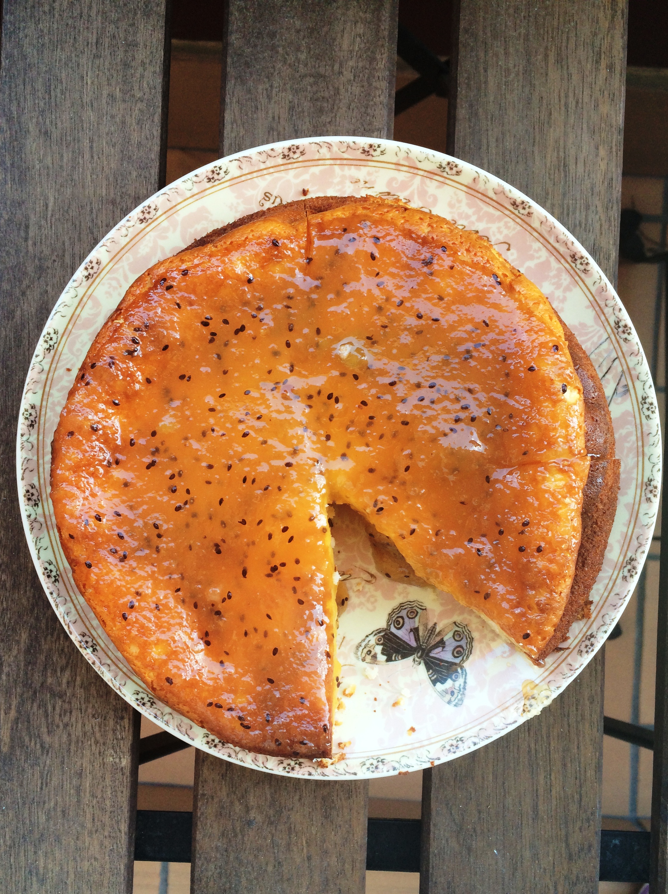 Sacamos la tarta del horno, la dejamos enfriar y desmoldamos. Cuando esté fría, le añadimos la mermelada por encima.