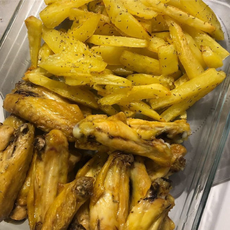 - Ingredientes: Patatas, tomillo, AOVE, sal y, por supuesto, alitas de pollo, la cantidad, la necesaria (yo siempre compro el pollo de corral, me lo despiezan y semana tras semana guardo las alitas en el congelador. Cuando tengo suficientes, las aso todas juntas. A mi marido le encantan los muslitos y a mí las alitas. Nos complementamos hasta en eso 🙂