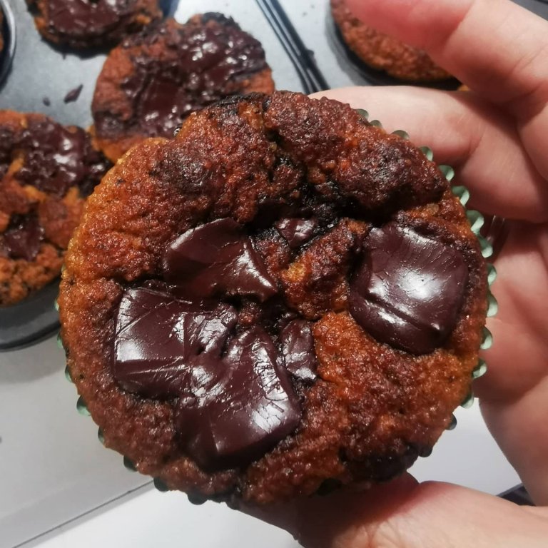 Ponemos la masa en moldes de muffin y añadimos el chocolate 82% cortado en dados para decorar