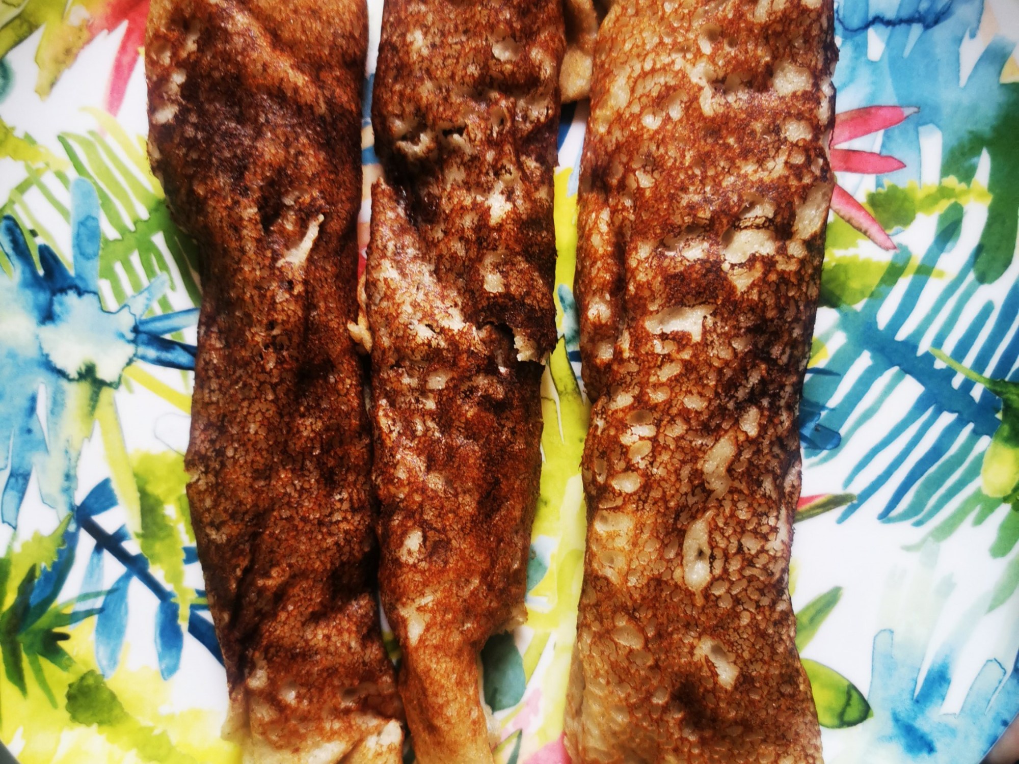 En principio pretendía que fueran crepes pero no soy capaz de darles la vuelta sin que se rompan, así que he decidido montarlos y enrollarlos en la propia sartén, y ni tan mal, oye!