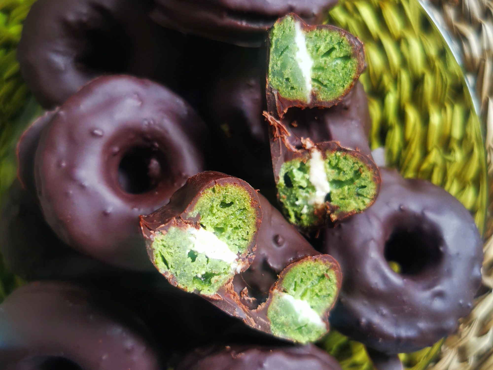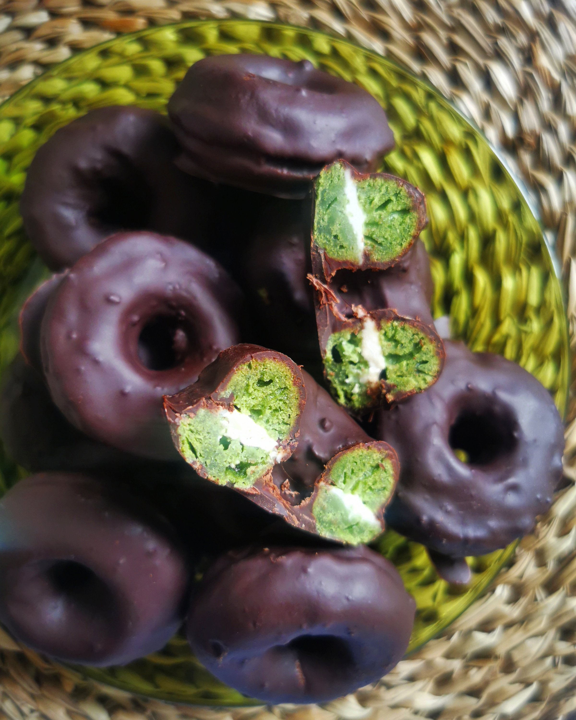Para la cobertura: Derretimos 2 cucharaditas de aceite de coco con 1 tableta de chocolate de más del 70% (yo los hice con un choco del 72% que había por casa de Mercadona) bañamos los donuts y los metemos al frigorífico hasta que se solidifiquen.